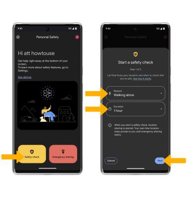1. From the Personal safety screen, select Safety check. Enter the desired Reason and Duration, then select Next.