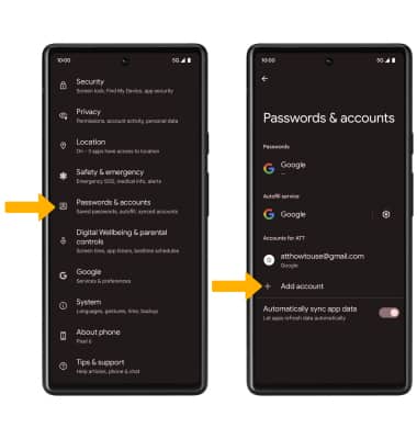 2. Scroll to and select Passwords & accounts. Select Add account.![]()