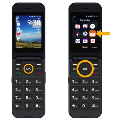 From the home screen, press the OK key to access the Apps tray. Press the navigational buttons to highlight the Calendar app, then press the OK key to select.