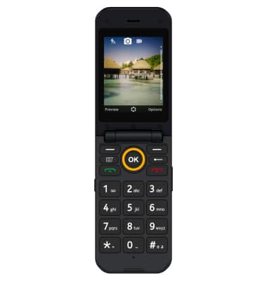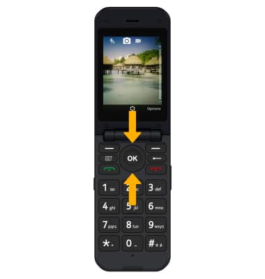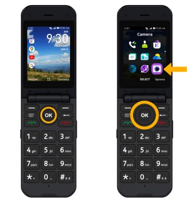 From the home screen, press the OK key. Press the navigational buttons to highlight the Camera app, then press the OK key to select.