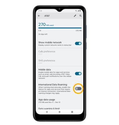 Note: Data roaming is off by default. Enabling Data roaming will allow the device to attach to foreign wireless network signals when available. International roaming charges will apply. This setting does not apply to voice access, which requires additional provisioning for usage on international networks. To learn more, visit the AT&T International website.