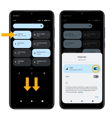 Swipe down from the Notification bar with two fingers. Select the Internet icon. Select your Network switch to turn mobile data on or off, then select Done.