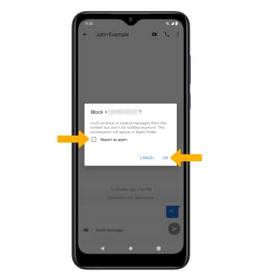 4. If desired, select the Report as spam checkbox to have the number reported to Google. Select OK to confirm.
