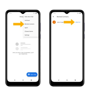 Menu icon > Blocked contacts. Select UNBLOCK next to the desired contact or number.