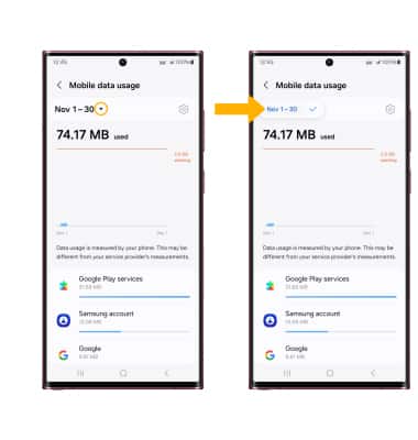 From the Mobile data usage screen, select the Data usage cycle drop-down then select the desired billing cycle.