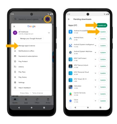 Play Store app > Account icon > Manage apps & device > Updates available > select Update next to the desired app or select Update all to download all available app updates.