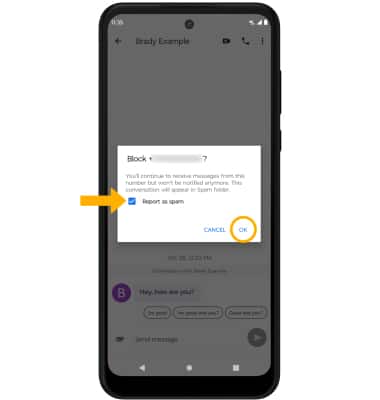 4. If desired, select the Report as spam checkbox to have the number reported to Google. Select OK to confirm.