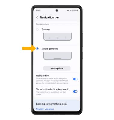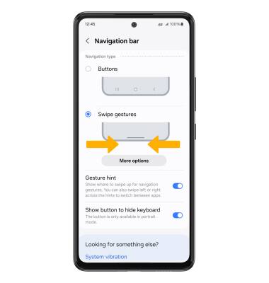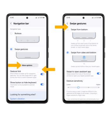 ENABLE: Enabling Swipe gestures allows you to swipe from different areas of the screen to go backwards, forwards, return to the home screen, and see your open apps. From the Navigation bar screen, select Swipe gestures.