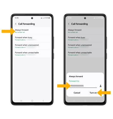 From the Call forwarding screen, select Always forward. Enter the desired Call forwarding number, then select Turn on.