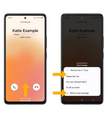 When receiving a call, swipe up from the bottom of the screen to decline a phone call and send a text message. Select the desired text message to send, or select Write a new message to write your own.