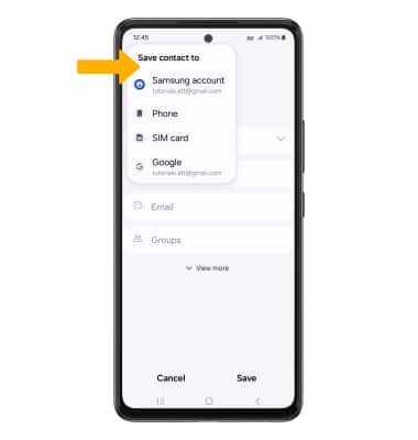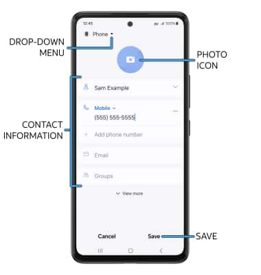 2. Enter the desired contact information in the corresponding fields. Select the drop-down icon to change the desired account you want to save the contact to. To add a picture, select the Photo icon then navigate to the desired image. Select Save when finished.