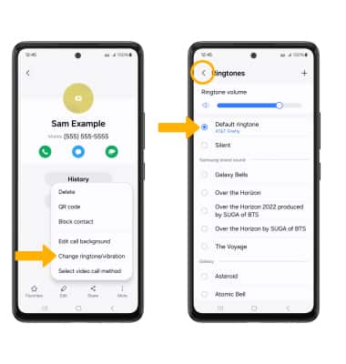 More icon then select Change ringtone/vibration > Ringtone. Select the desired ringtone, then select the Back arrow.