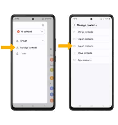 Menu icon > Manage contacts > Export contacts and follow the prompts.