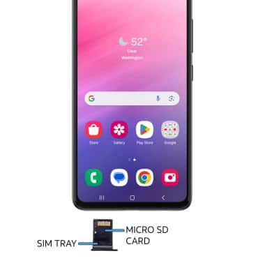 Insert the microSD card into the back of the SIM tray with the gold contacts facing up and the notched edge on the bottom right. Gently press the microSD card in until it clicks into place.