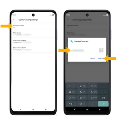 From the Call forwarding screen, select Always forward. Enter the desired Call forwarding number, then select TURN ON.