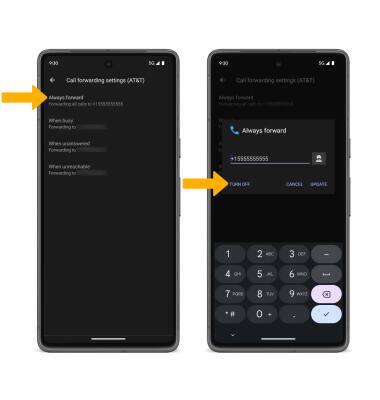 Note: To change the Call forwarding number while Call forwarding is already active, from the Always forward screen, edit the number then select UPDATE.