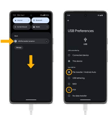 2. To place the device into the correct USB mode, swipe down from the Notification bar, then select the Android System drop down menu > Charging notification > File transfer / Android Auto or PTP.