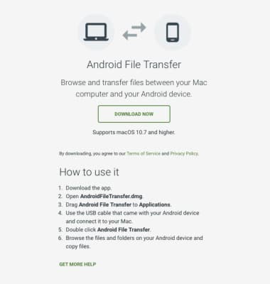 1. You need the Android File Transfer app to facilitate communication between your device and a Mac computer. Download and install the Android File Transfer app.