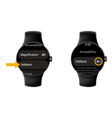 From the Accessibility screen, select TalkBack, then select the TalkBack switch to place it in the On position.