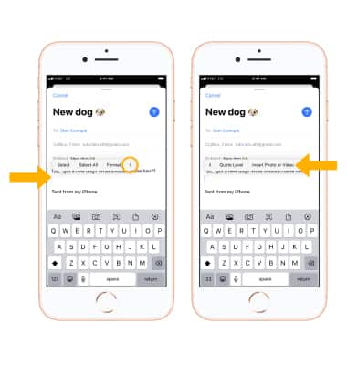 3. To add an attachment, select and hold the desired location in the text field then select the right arrow to scroll to and select Insert a Photo or Video. Follow the prompts, then select the