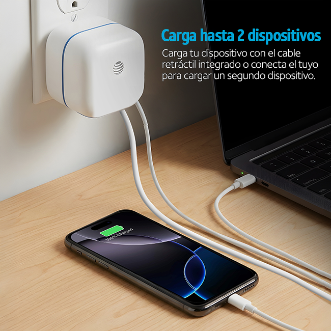 Carga más rápido y sin cables dondequiera que vayas. Este cargador de pared de 65 W carga tus dispositivos hasta un 80% más rápido que los cargadores estándar, por lo que es perfecto para laptops, tablets y teléfonos. El cable USB-C retráctil, las clavijas flexibles y el diseño compacto mantienen tu espacio ordenado, mientras que la capacidad para cargar dos dispositivos garantiza que nunca te quedes sin batería. Es elegante, portátil y está diseñado para ofrecer velocidad.