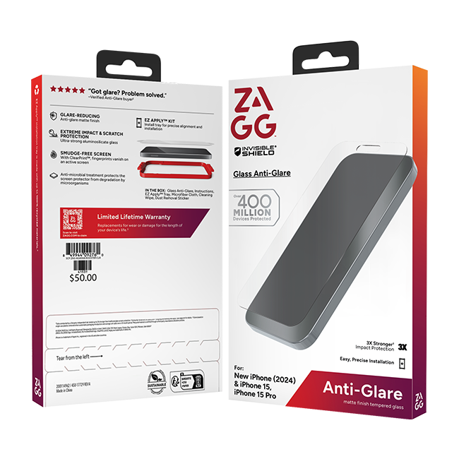 Protector para pantalla antimicrobiano Zagg Invisible Shield Glass contra el brillo y las huellas dactilares para el iPhone 16/15/15 Pro