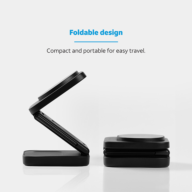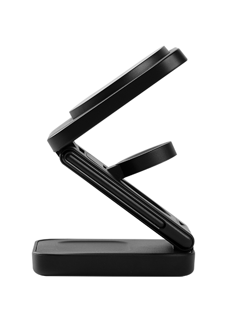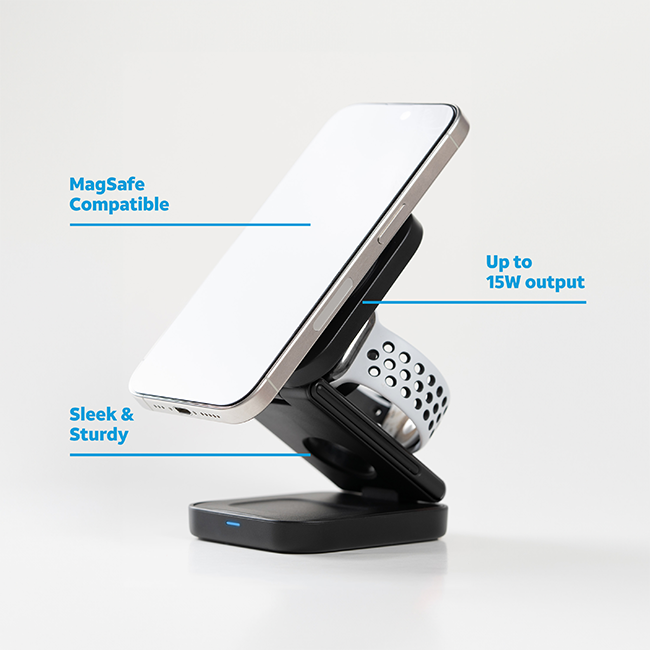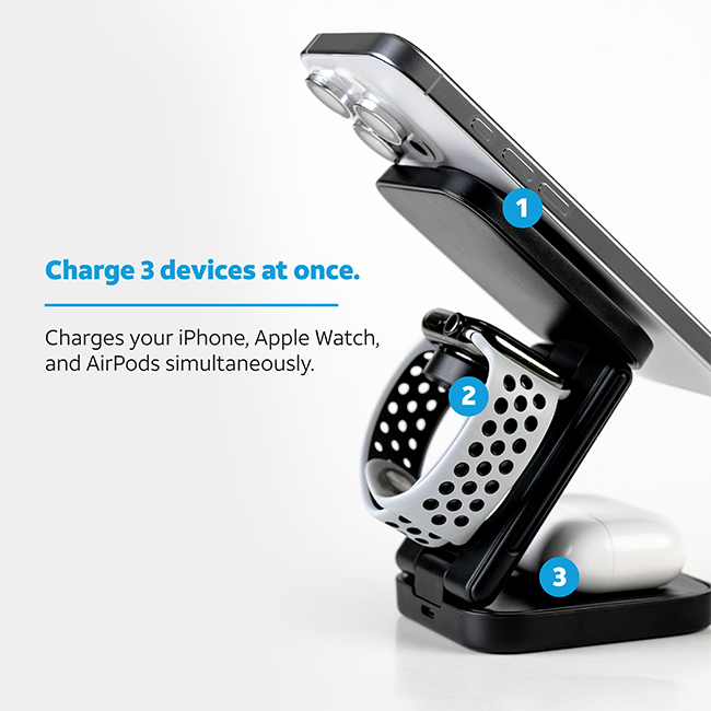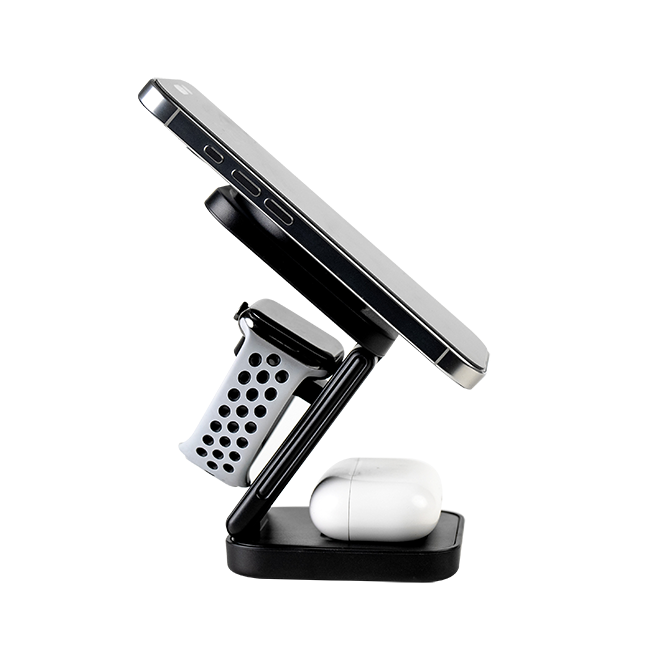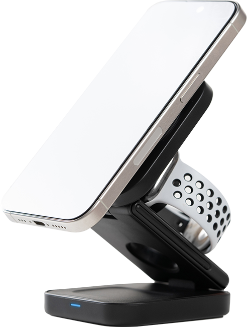 Este versátil soporte plegable de carga 3 en 1 te permite cargar tu iPhone, tu Apple Watch y tus AirPods, todo en un solo lugar. La almohadilla de carga compatible con MagSafe® garantiza una carga segura y eficiente para tu iPhone, mientras que las ranuras integradas se adaptan a tu Apple Watch y tus AirPods. Nuestro soporte se pliega para guardarlo con facilidad y llevarlo de viaje, lo que lo vuelve ideal para usarlo mientras vas de un sitio a otro. La construcción duradera y minimalista asegura un rendimiento prolongado y una apariencia elegante. Nuestro soporte de carga 3 en 1 es indispensable para simplificar tu rutina diaria y mantener tus dispositivos cargados.