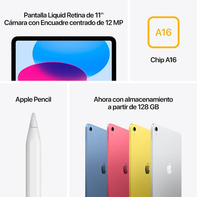 El iPad de 11 pulgadas es ahora más poderoso que nunca con el chip A16 superrápido, la pantalla Liquid Retina,1 cámaras avanzadas, Wi-Fi 6 rápido y compatibilidad con 5G,2 conector USB-C y cuatro preciosos colores. El iPad ofrece una forma eficaz de crear, estar conectado y hacer cosas, todo a un precio sorprendentemente económico.