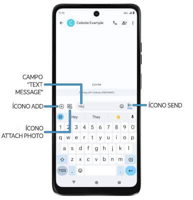 AÑADIR ARCHIVO ADJUNTO: selecciona el ícono Add para adjuntar un GIF, sticker, ubicación, contacto o archivo. Selecciona el ícono Attach photo para adjuntar una foto desde la galería o para tomar una foto.