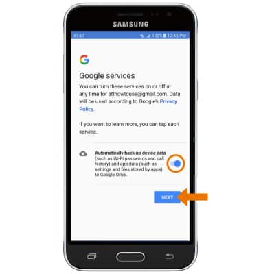 - Revisa la indicación de servicios de Google y si lo deseas, selecciona el botón Automatically back up device data para desactivar esta función si así lo deseas. Selecciona NEXTpara completar el registro en Google.