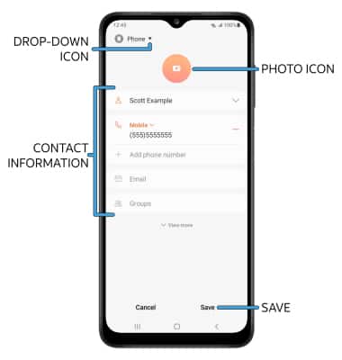2. Ingresa la información de contacto deseada en los campos correspondientes. Selecciona el ícono desplegable para cambiar la cuenta en la que deseas guardar el contacto. Para añadir una foto, selecciona el ícono Photo, luego ve a la imagen deseada. Selecciona Save cuando termines.