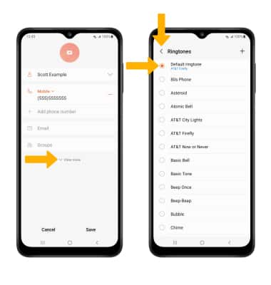 En la pantalla de edición del contacto, selecciona View more, luego selecciona Ringtone. Selecciona el tono de timbre deseado, luego selecciona la flecha Back.