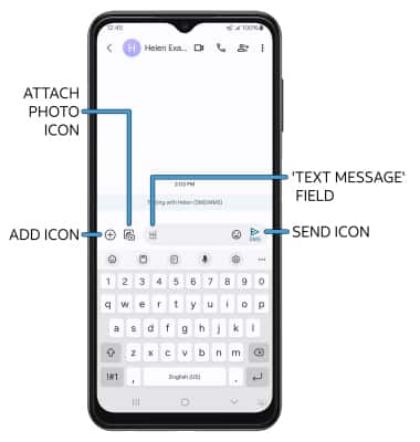 • AÑADIR ARCHIVO ADJUNTO: selecciona el ícono Add para adjuntar un GIF, sticker, ubicación, contacto o archivo. Selecciona el ícono Attach photo para adjuntar una foto desde la galería o para tomar una foto.